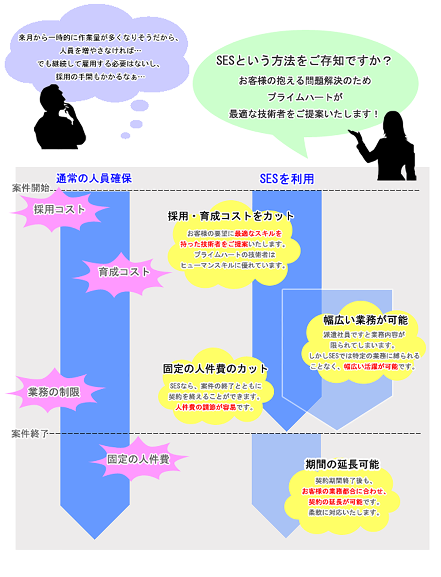 プライムハートでは、高いヒューマンスキルで様々な問題を解決、 コスト・運用面でビジネスの効率化を図ります。